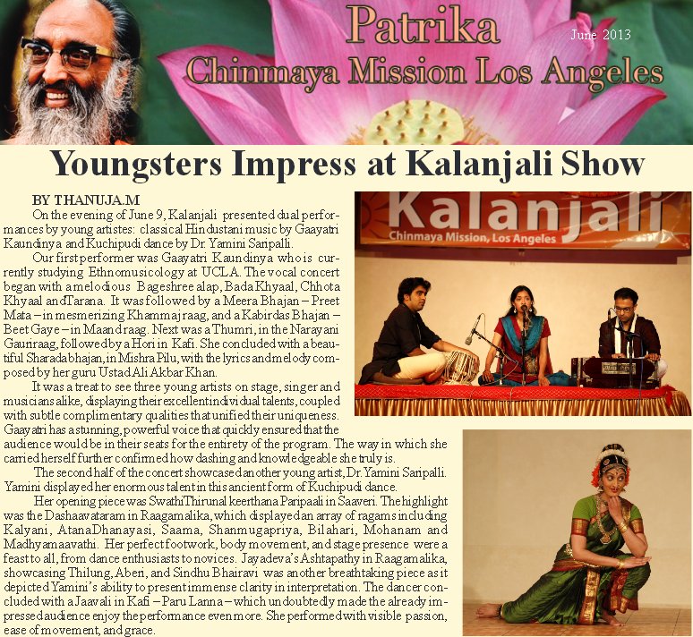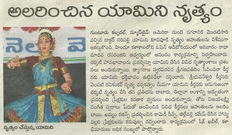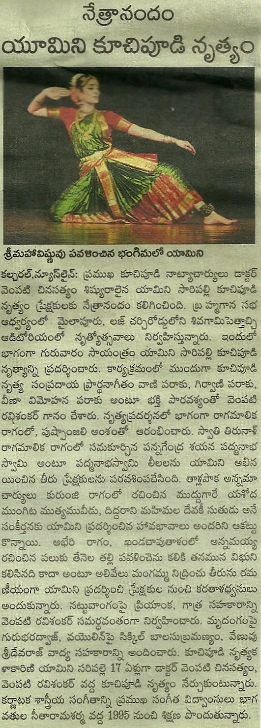 | "Ultimately it is peace within that we seek (within ourselves), and that is what we get from our classical Indian dance forms" - Dr. Sunil Kothari PRESS Melange of styles - Velcheti Subrahmanyam, The Hindu, Jan 7, 2016 S.Yamini, a disciple of Vempati Ravi Sankar, danced ‘Manduka Sabdam’ well depicting the episode of Gajendramoksham from Bhagavatam. However it was her presentation of ‘Etuvantivade’ a padam of Kshetrayya stood out. That she has a good sense of laya was evident all through. Yamini Saripalli: Doctor and dancer - Bhavanvitha Venkat, June 4, 2015 , www.narthaki.com A Kuchipudi Encounter - Lakshmi Vishwanathan's direct speak, Feb 9, 2015 Yamini Saripalli, who is also from Washington , a mature dancer who did complete justice to the Vempatti school in her performance. Credit goes both to the Guru who has maintained a high standard of technique and a carefully chosen repertoire, and to the hard work of these dancers. They are united in keeping the reputation of Kuchipudi dance in tact. All for a Cause - Radhika Baruah, Assam Tribune, Dec 2014