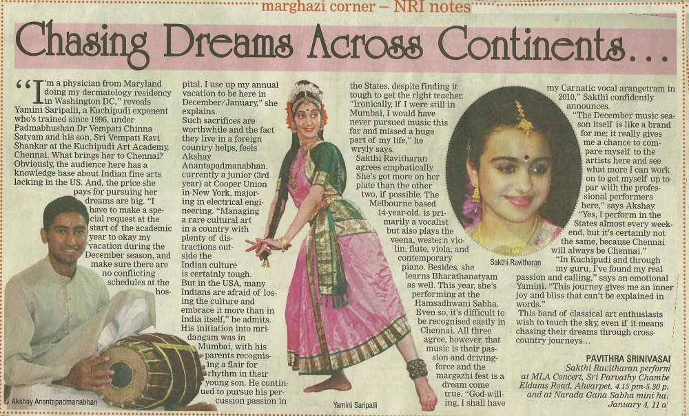 "Yamini Saripalli's Thillana, composed by Guru Vempati Chinna Satyam, was enthralling" - Deccan Chronicle, December 26, 2000 "express(es) herself in dance through a deep, involved technique and clarity in interpretation...strike(s) the perfect balance between her profession and her passion with perfect ease and grace" - The Hindu; January 29, 2005 "excellent body movements and stage presence" - SV Raman, dance critic for Indian Express, Chennai, November 9th, 2006 "Chasing dreams across continents" - Pavithra Srinivasan, Chennai Times |