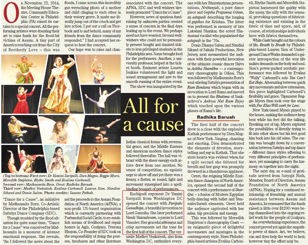 | "Ultimately it is peace within that we seek (within ourselves), and that is what we get from our classical Indian dance forms" - Dr. Sunil Kothari PRESS Melange of styles - Velcheti Subrahmanyam, The Hindu, Jan 7, 2016 S.Yamini, a disciple of Vempati Ravi Sankar, danced ‘Manduka Sabdam’ well depicting the episode of Gajendramoksham from Bhagavatam. However it was her presentation of ‘Etuvantivade’ a padam of Kshetrayya stood out. That she has a good sense of laya was evident all through. Yamini Saripalli: Doctor and dancer - Bhavanvitha Venkat, June 4, 2015 , www.narthaki.com A Kuchipudi Encounter - Lakshmi Vishwanathan's direct speak, Feb 9, 2015 Yamini Saripalli, who is also from Washington , a mature dancer who did complete justice to the Vempatti school in her performance. Credit goes both to the Guru who has maintained a high standard of technique and a carefully chosen repertoire, and to the hard work of these dancers. They are united in keeping the reputation of Kuchipudi dance in tact. All for a Cause - Radhika Baruah, Assam Tribune, Dec 2014
